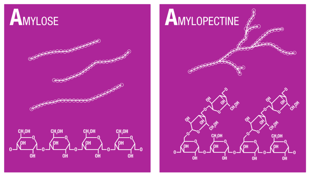 Les amidons sont des composés glucidiques constitués de deux polymères de glucose : l’amylose et l’amylopectine.