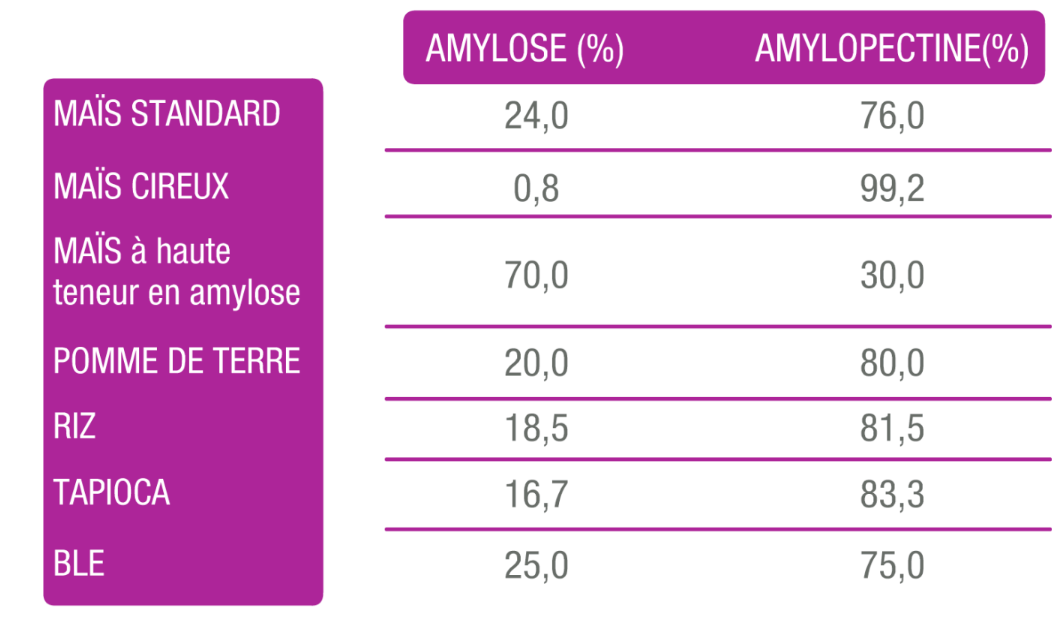La teneur en amylose et amylopectine dépend de chaque plante et variété botanique.